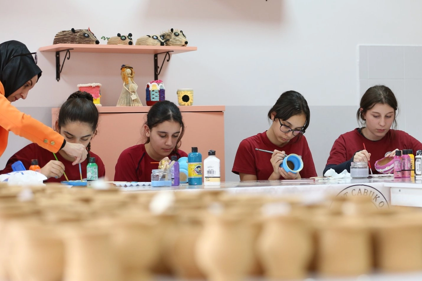 Resim öğretmenleri ve usta öğreticiler eşliğinde çalışan öğrenciler, çömlekten takı kutuları, mumluklar, şekerlikler, vazolar gibi çeşitli dekoratif ürünler ve mutfak eşyaları üretiyor. Şekillendirilen ve kurutulan çömlekler, daha sonra öğrencilerin yaratıcılıklarını konuşturduğu renkli boyamalarla tamamlanarak okullarında gururla sergileniyor.